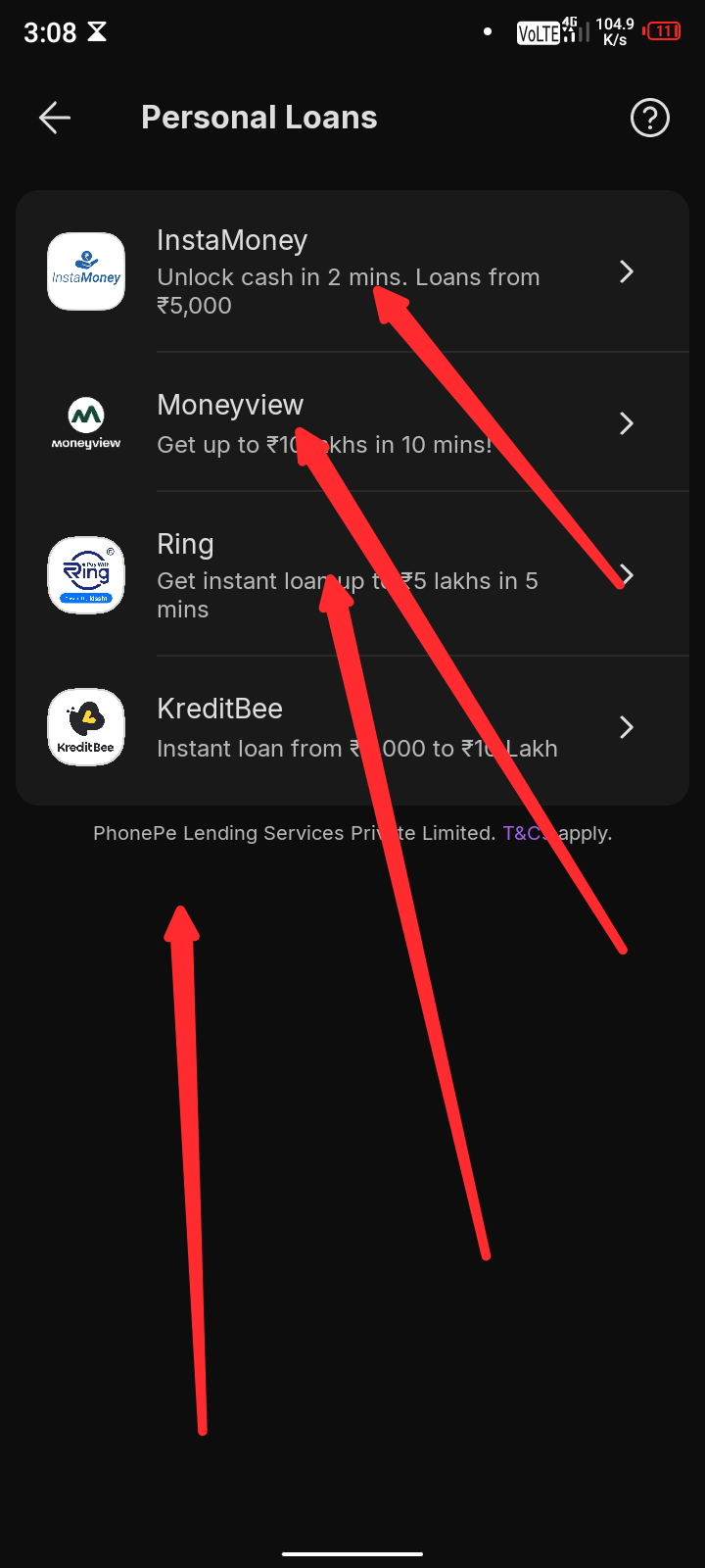 पर्सनल लोन ऑप्शन क्लिक करने पर आपके यहां पर उन बैंक तथा एप्लीकेशन के नाम दिखाई देंगे जो आपको लोन प्रोवाइड कर सकते हैं एक बात आप जान लीजिए फोनपे एप्लीकेशन कभी भी स्वयं लोन नहीं देता है यह दूसरे बैंक से लोन दिलाने का काम करता है यहां पर आपको अलग बैंक के नाम दिख सकते हैं जो आपको सही लगे उस बैंक पर क्लिक करें।