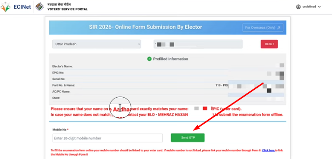 Mobile Number को लिखने के बाद आपको Send OTP पर क्लिक करना हैं, उसके बाद आपके Mobile Number पर OTP आएगा उसे लिख दें और Submit कर दें,