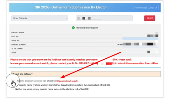 OTP दर्ज करके मोबाइल नंबर का वेरिफिकेशन पूरा कर दें इसके बाद आपको Category का चयन करना हैं, अगर आपका 2003 की वोटर लिस्ट में नाम हैं तो आपको सबसे ऊपर वाले ऑप्शन को टिक करना हैं अगर आपका नाम वोटर लिस्ट में नहीं है तो आपको My Parents के ऑप्शन को सेलेक्ट करना हैं, इसको आप पढ़कर सेलेक्ट करें, और सबमिट कर दें,
