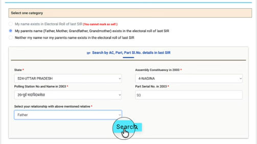 अब आपके सामने यह पेज खुलेगा और यह सब ऑप्शन देखने के लिए मिलेंगे आपको सबसे पहले अपने राज्य का नाम चयन करना है उसके बाद Assembly Constituency in 2003 को सेलेक्ट करना है फिर Polling Station No and Name in 2003 को सेलेक्ट करें उसके बाद आपको Part Serial No. in 2003, और Father या Mother आप अपने हिसाब से चयन करें उसके बाद Search पर क्लिक कर दें,