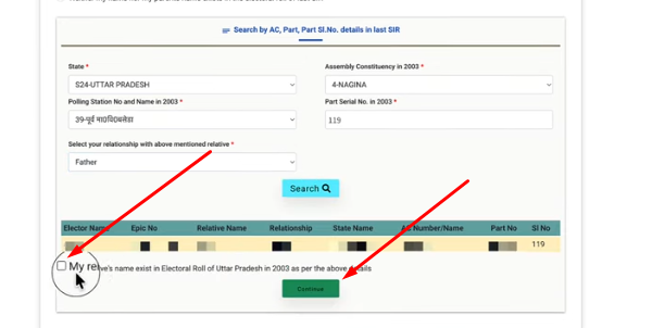 अब आपका नाम आपके पिता का नाम और आपके एपिक नंबर Show होगा यहाँ पर आपको Tick बॉक्स को क्लिक करके Continue पर क्लिक कर देना हैं,