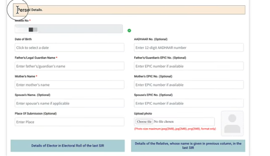 अब SIR फॉर्म ऑनलाइन खुल जाएगा अब इसको आपको भरना है इसमें आपको अपना नाम अपना आधार नंबर अपने पहचान पत्र का नंबर अपने माता का नाम पिता का नाम माता का पिता का पहचान पत्र का नंबर तथा मोबाइल नंबर तथा अन्य सभी जानकारी को पढ़कर भर देना हैं जैसे Offline फॉर्म भरने का तरीका इस लेख में बताया हैं उसके बाद आपको अपना फोटो अपलोड कर देना हैं,