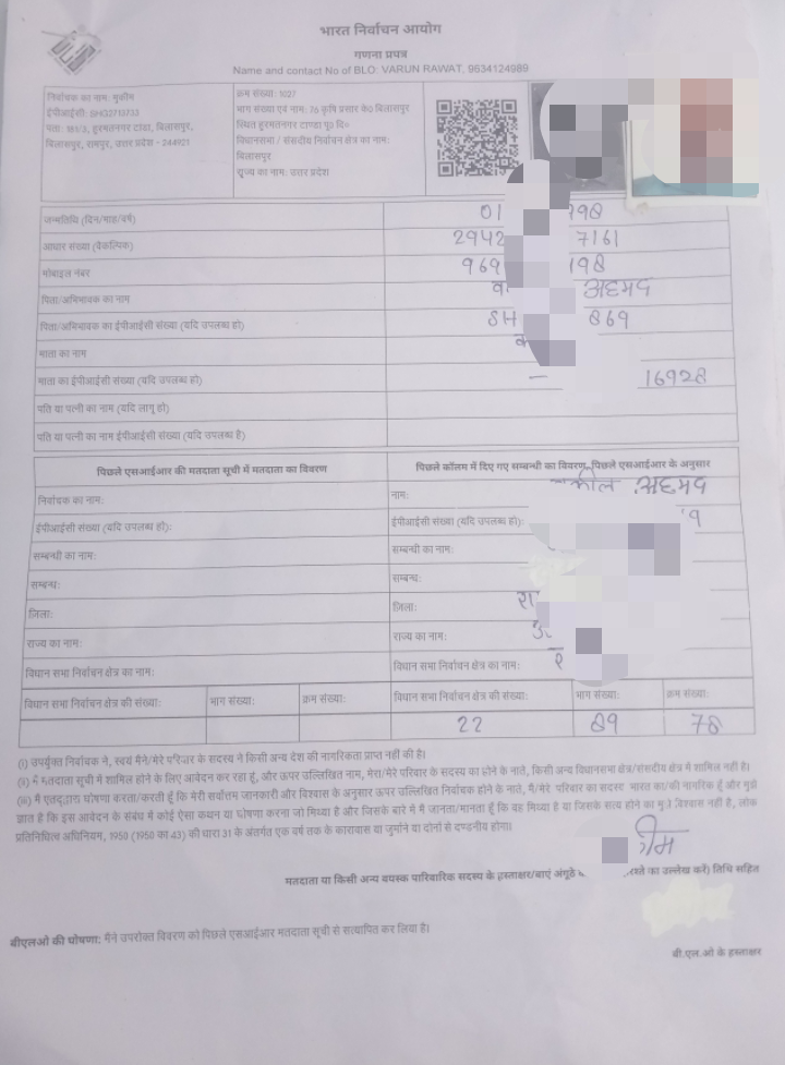 एस आई आर फॉर्म को भरने के लिए जरुरी दस्तावेज अपने पास उपलब्ध कर लें जो लगेंगे पहले उनको जान ले, आपके आधार कार्ड का नंबर लगेगा फॉर्म में आपके जन्मतिथि लिखी जाएगी आपके माता पिता का नाम तथा आपके दादा या दादी का नाम लिखा जाएगा और आपके पहचान पत्र का नंबर ओर आपके माता पिता का पहचान पत्र का नंबर लिखा जाएगा उसके बाद आपके माता या पिता में से किसी एक की 2003 की वोटर लिस्ट में नाम देखकर भाग संख्या, निर्वाचन संख्या और विधान सभा को लिखना होगा। सबसे पहले आप इस फॉर्म को देख लीजिए फिर एक एक करके इसको भरने का तरीका जानते हैं,