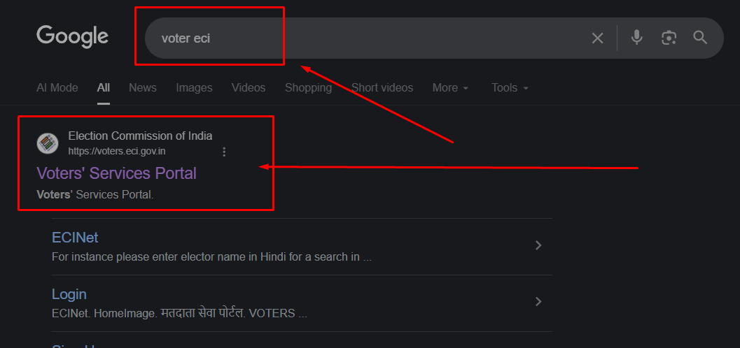 सबसे पहले आप अपने मोबाइल में या कंप्यूटर में गूगल को ओपन करें उसके बाद Voter Eci लिखकर सर्च करें उसके बाद पहली वेबसाइट को क्लिक करके ओपन कर लें,